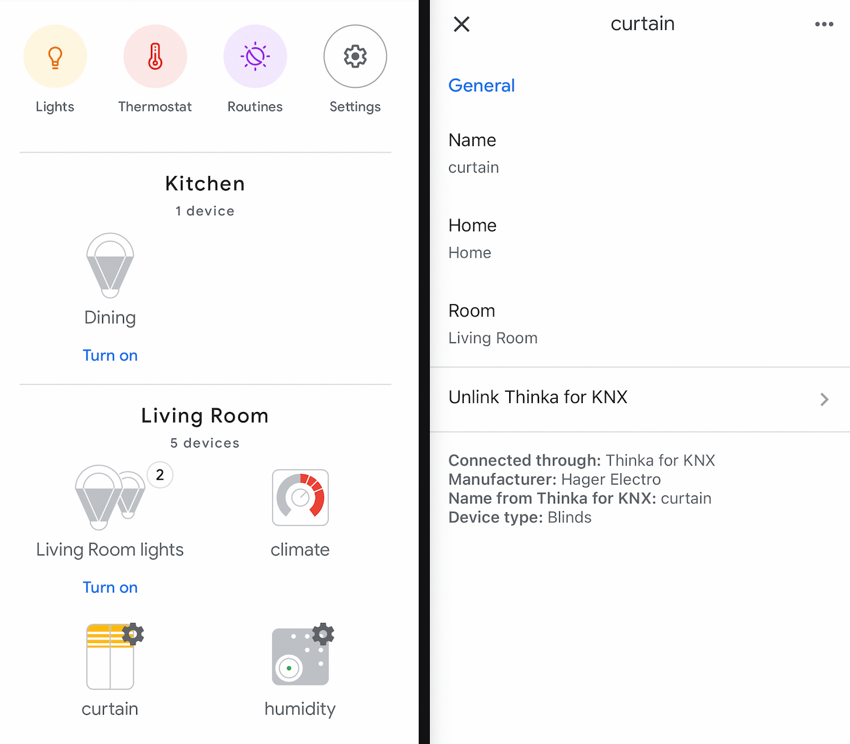 Unfortunately you can only see an icon for curtains or blinds in the Google Home App. There is not way to control it, this is a serious limitation of the Google Home App.