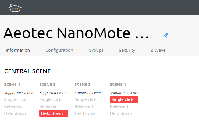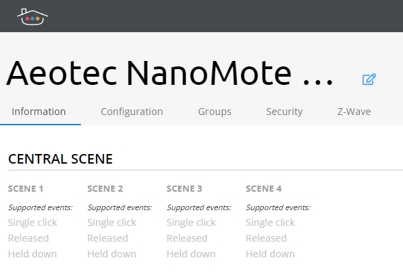 After adding your Z-Wave push button device on Thinka you will see supported scenes and events under Information tab on the device detail page