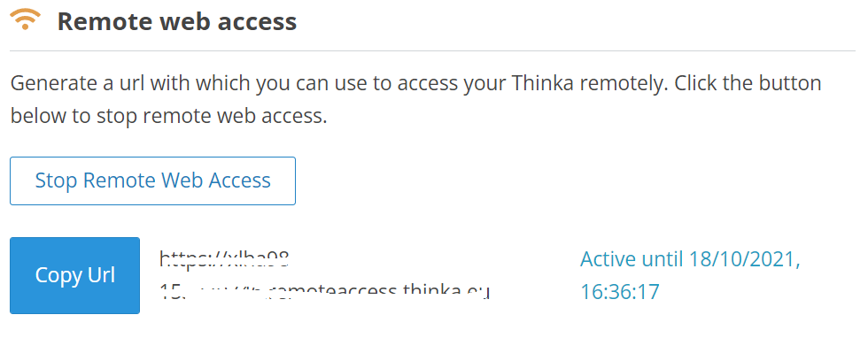 Z-WaveThis is what we call "Installer support". In order to allow the installers that manages your Thinka Z-Wave access, go to your Thinka's web interface and then click settings icon at the right side of the page. Scroll down and click 'Start Remote Web Access'. This will generate a link. Use the 'Copy URL' and share this link with your installer via e-mail, whatsapp or any other way that you trust.With the link (URL) your installer has access to the web interface of your Thinka. If you have a password set on your Thinka, either remove it (see here) or share it too. Be careful with sharing this URL and password, anyone that gets hold of it, can access your Thinka's web interface.You can always decide to revoke the access again. After 14 days we automatically revoke access to protect you from forgetting to revoke it all together. The next time you grant access the URL will be different.Here are the some images with regards to remote web access
